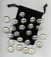 These attractive glass gem runes are perfect for new practitioners and those who do not wish to purchase a more expensive rune set. Elder Futhark symbols are hand-painted in gold on glimmering iridescent glass gems and then sealed for durability. Perfect as an introductory rune set or to give as a gift. Set of 25 runes in a black velveteen pouch.