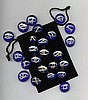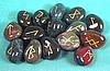 Rune set consisting of of 25 tumbled, polished banded agate handcrafted with engraved, gold-painted lettering. Also comes 10 sets per bag.
